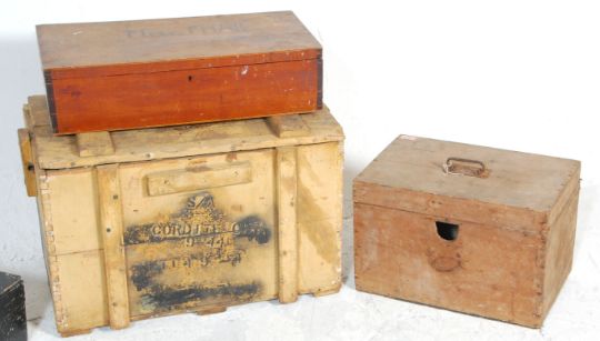 A group of four wooden Industrial storage boxes dating to the early 20th century. To include a pine square example with a hinged cover, one oak and another carpenters carry trunk case being painted black etc. Measures 45x75x45cm.