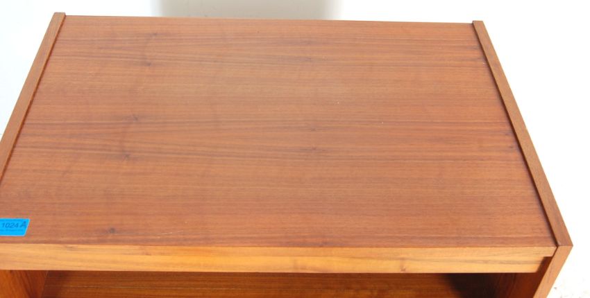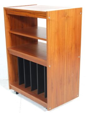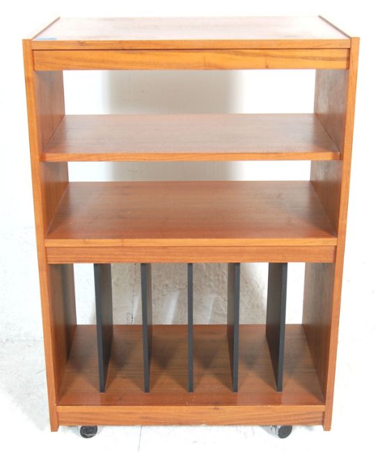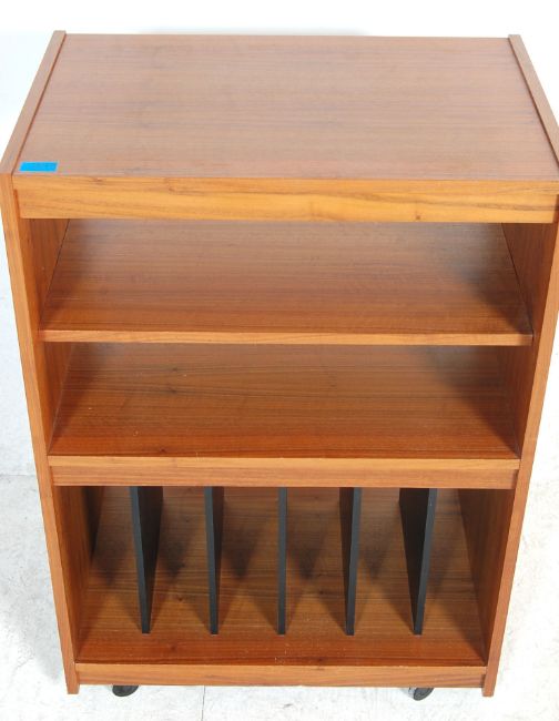 A vintage retro 20th century teak wood pedestal entertainment unit cabinet of Danish manner. The cabinet having two shelves to the top with a record / vinyl sectinal rack below having ebonised dividers. All being raised on castors to the base. Measures 88 x 60 x 40cm.