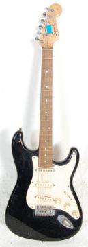 A vintage 90s Squier Strat by Fender Affinity Series Stratocaster electric guitar instrument having a C-shaped neck profile, single-coil, stratocaster pickups, vintage-style tremolo bridge, satin neck finish with white scratch guard and chrome tuning pegs.