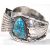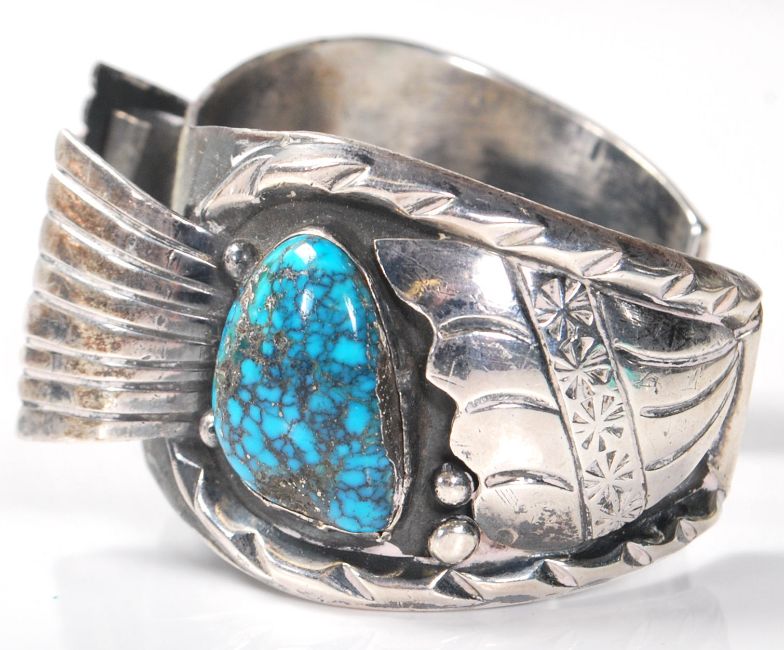 Two pieces of silver white metal Native American Navajo jewellery to include a bangle set with a large turquoise stone flanked by two further stones with cast decoration throughout (central stone loose and in need of resetting), together with a watch bangle having winged clasps around a Timex watch with green stones set to the sides.