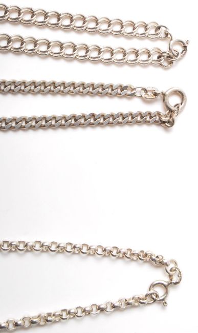 A selection of silver necklaces to include a flat linked pointed necklace chain (stamped 925), a floral collar necklace (hallmarked London 1993), a flat link necklace chain (stamped 925 silver), and a double link silver necklace chain (stamped 925). Total weight 61.5g. Longest measures 19.5 inches.