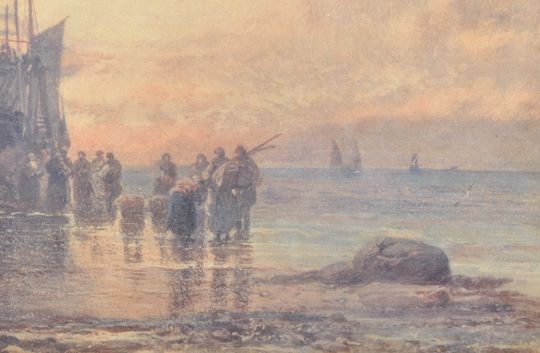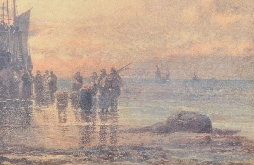 After Norman Wilkinson - A print of a watercolour painting of a British battleship at sea being framed and glazed, signed to the corner. Together with another 19th century print of a maritime coastal scene with fishing fleet at low tide and with people on the beach.