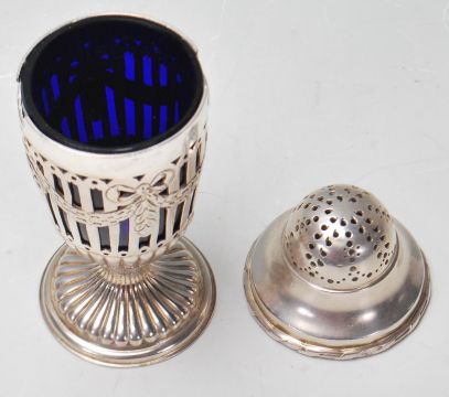 A 20th Century Edwardian style sugar shaker in the shape of a classical urn having a pierced lid and garlanded decoration to the body sat atop a ribbed circular base. Weighs 173g, 13cm high.