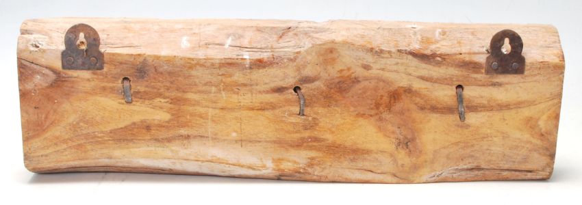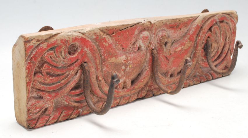 A 20th Century carved folk art wooden wall mounting set of coat hooks decorated with peacocks with distressed red paintwork. Measures 16cm height.
