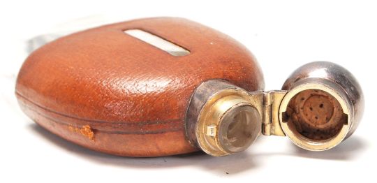 A silver 20th Century GW&g  hallmarked drink flask with leather cover and glass body, having bayonet twist cap and removable cap base. The hallmarks are illegible. Measure 14cm tall and GW 232g. Measures 14cm tall.