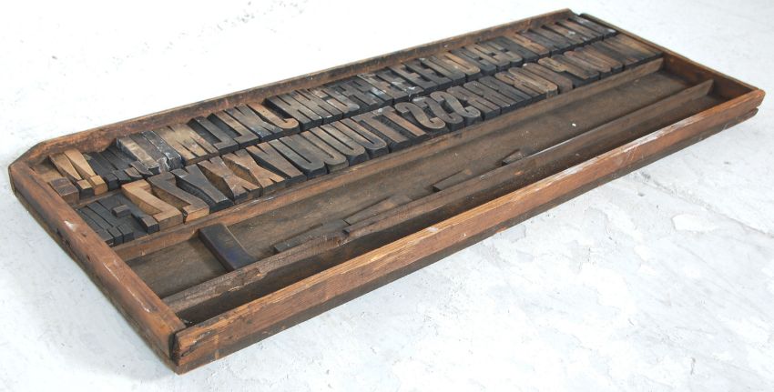 A large collection of good sized Industrial 20th century printers block advertising letters mounted on wooden blocks various letters of differing sizes and set within trays of rectangular form. Measuring 85 cm x 36 cm.