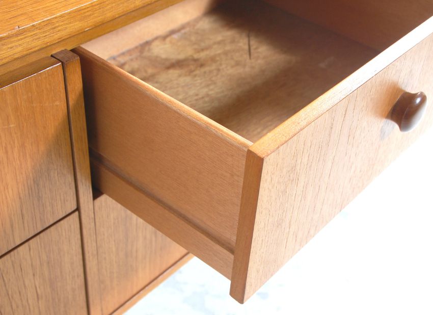 A retro vintage mid 20th Century teak danish influenced  cresenza sideboard. Of low and wide form with circular drawer handles to the six drawers. All raised on square legs.  Measures 66 x 151 x 44