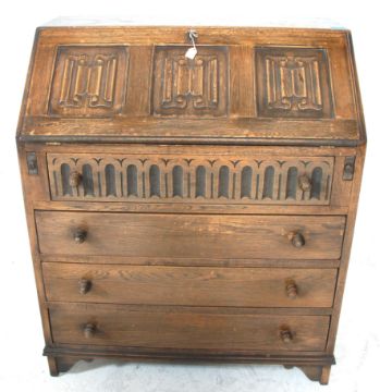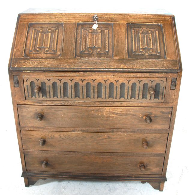 A Jacobean revival 1930's oak bureau decorated with linen fold motif having a fall front desk to reveal a sectional interior above three drawers raised on bracket feet.. 80 x 75 x 40