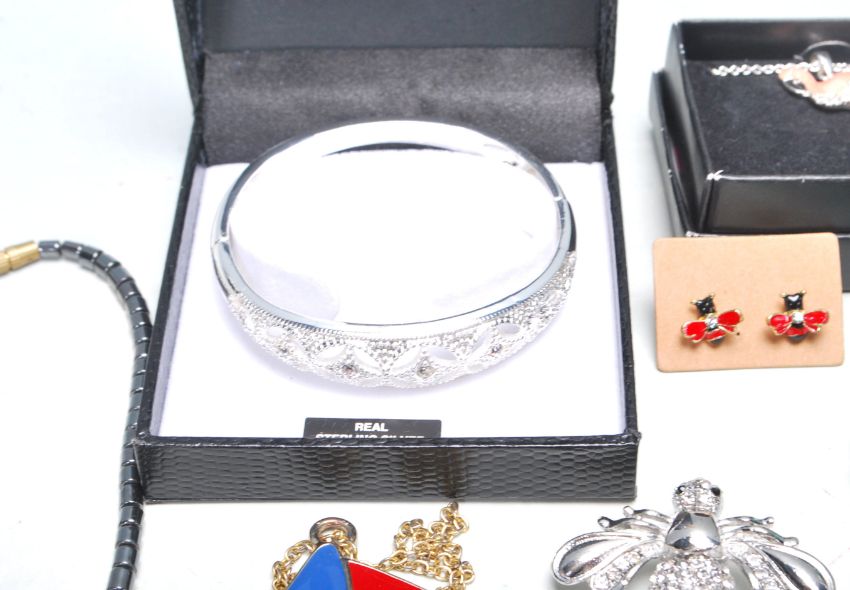 A collection of vintage costume jewellery to include two pairs of boxed gentleman's cufflinks, an enamelled boat pendant necklace, white metal brooches including one bug brooch, a tie pin with enamelled sailing boat, a flamingo design necklace etc.