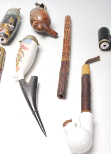 A collection of vintage German porcelain smoking lidded pipes with ceramic bowl and wooden stem, having hunting scenes transfer print to the ceramic body. Measures 32cm long.