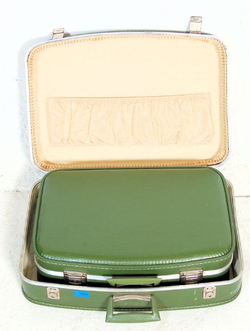 A good set of vintage retro 1960's graduating set of  suitcases finished in green with an aluminium band around the opening edges, steel locks and cream fabric inlaid. Measures 45 x 65 x 15 cm