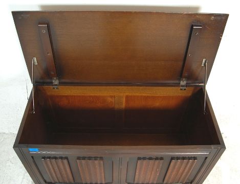 A mid century Jacobean revival oak blanket box/chest with hinged top over panelled sides with carved linen fold raised decoration to the front panel. All raised on block feet. Measures 50 x 95 x 42 cm
