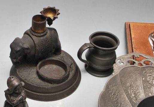 A good collection of assorted brass, copper, pewter items to include cast metal table lighter, pewter jug, inkwell, trench art brass pin tray, pair of English bulldogs belt buckle, pewter trays and desk tidy, etc.