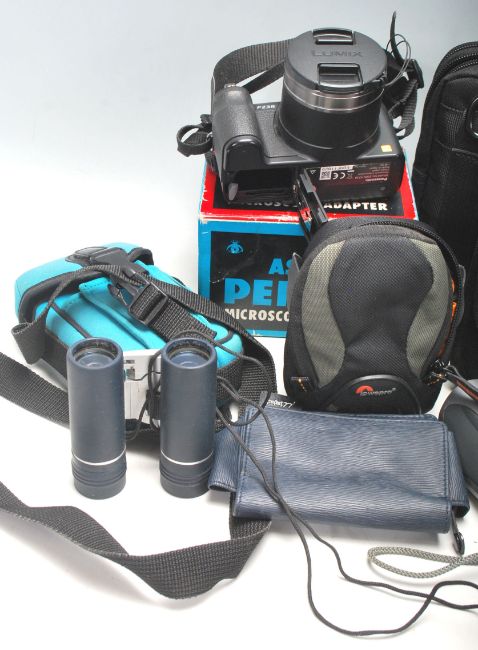 A collection of vintage retro camera equipment to include a Pentax P30, Lumix FZ38, SMC PENTAX- A Zoom lens, Pentax Microscope adapter, 2 x Canon PC 1354, Canon PC 1740, Olympus 10 x 21 DPC Binoculars, Arena 8 x 21 Binoculars, Olympus C310 Zoom, various camera cases and memory cards etc.