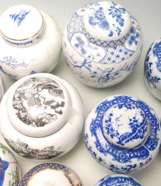 A collection of fifteen 20th Century Chinese blue and white printed ginger jars to include a good selection of examples decorated with Chinese dragons, female figures and floral sprays, also includes a hand enamelled example with children playing in a garden.