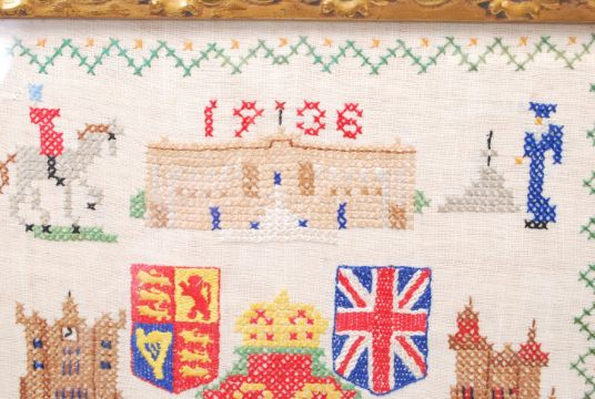 An original 1936 Edward VIII commemorative embroidery sampler, 1936 dated above Buckingham Palace, Royal cypher to the central and British and Commonwealth to the bottom. Framed and glazed. Measures 38cm x 32cm.