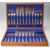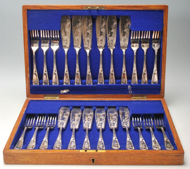 A 19th century Victorian William Hutton & sons silver plated canteen of cutlery comprising of twelve knifes and twelve forks with decoration to the handle and blade and oak case with purple interior.