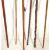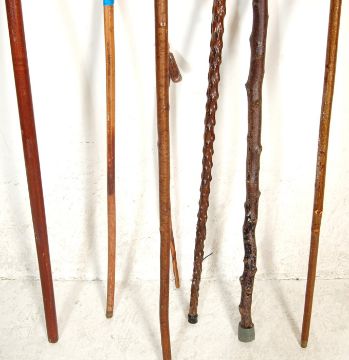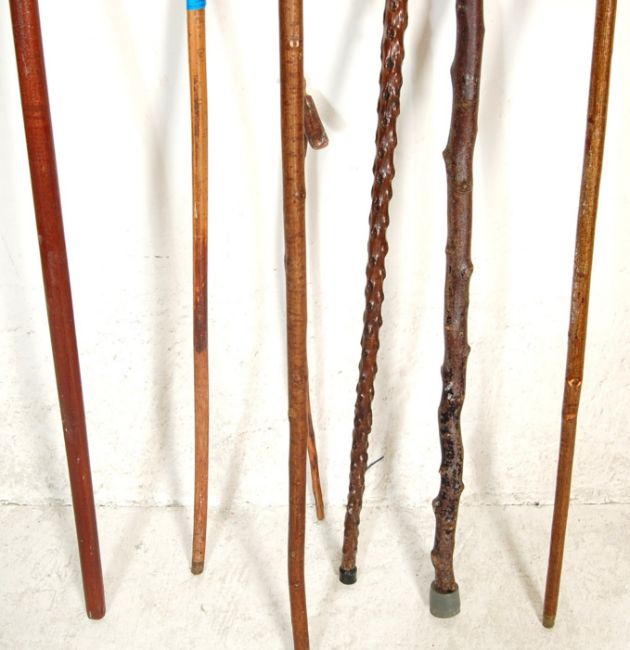 A collection of mixed 20th Century walking stick canes to include four walking sticks with horn handles, a blackthorn walking stick, and a knotted hardwood stick with a crook handle.