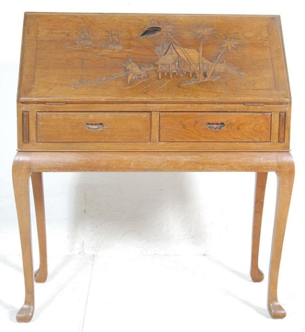A 20th Century, circa 1950's vintage retro oriental hardwood writing desk bureau having a sloped fall front top with carved decoration of a oriental scene with a fisherman and palm trees having twin drawers with recessed handles and raised on cabriole legs. Measures 108 cm high x 92 cm wide x 47 cm deep.