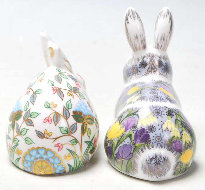 A pair of Royal Crown Derby paperweights both in the shape of rabbits including Springtime Bunny & Springtime Rabbit designed by Lisa Law. Both with intricate detailing and edged with gilt and both with gold stoppers. Height measures 8cm.
