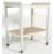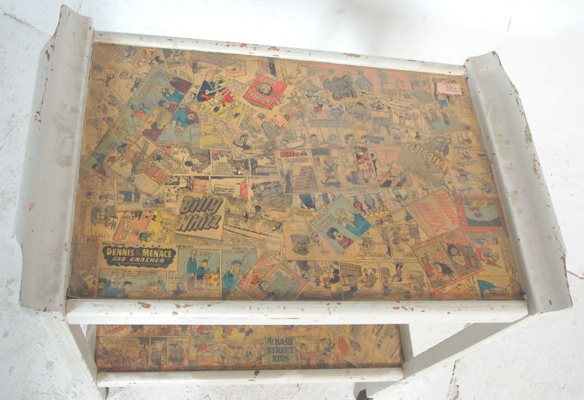 An early 20th century century shabby chic painted two tier trolley with decoupage decoration Raised on squared legs with castors having gallery edge tiers being decoupage decorated with Beano comic scenes Measures 74x68x44cm.
