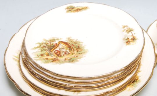 An early 20th century Alfred Meakin English tea service to include six cups, six saucers plates, a jug and a bowl. All being decorated with cottage scene and gilded rim. Height measures 23cm.