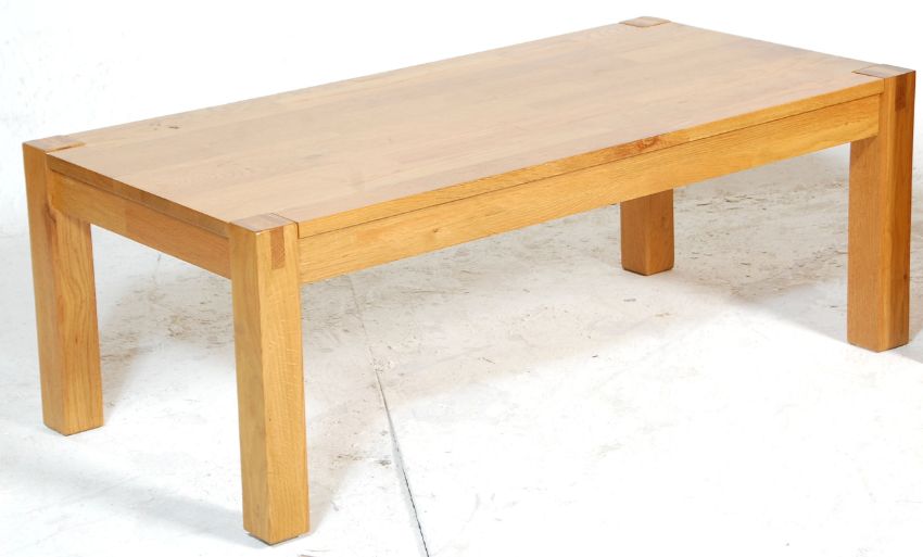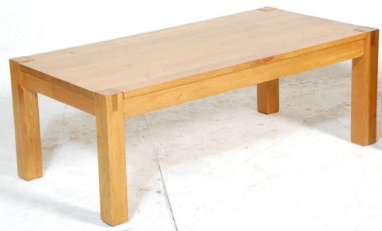 A modern contemporary hardwood DFS side table chest together with a matching long john coffee table. Each raised on squared legs, the side chest with a bank of 3 drawers having knob handles with flared top above. Measures 60x53x40cm.