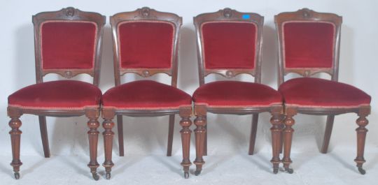 A 19th Century Victorian mahogany extending dining table having  square top with leaf beneath and chamfered edges, raised on turned knopped legs with brass feet together with a set of six dining chairs having red velvet overstuffed seats with carved shell details to the top raised on carved turned legs. Measures 70 x 105 x 142cm