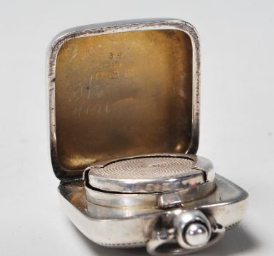 A silver hallmarked sovereign case having engraving decorations to the front and back with a push button lock and a spring action hinged lid. Hallmarks for Birmingham “ m “ 1911 by Joseph Gloster LTD. Weight 19.86g. Measures 1cm x 3cm x 3cm.
