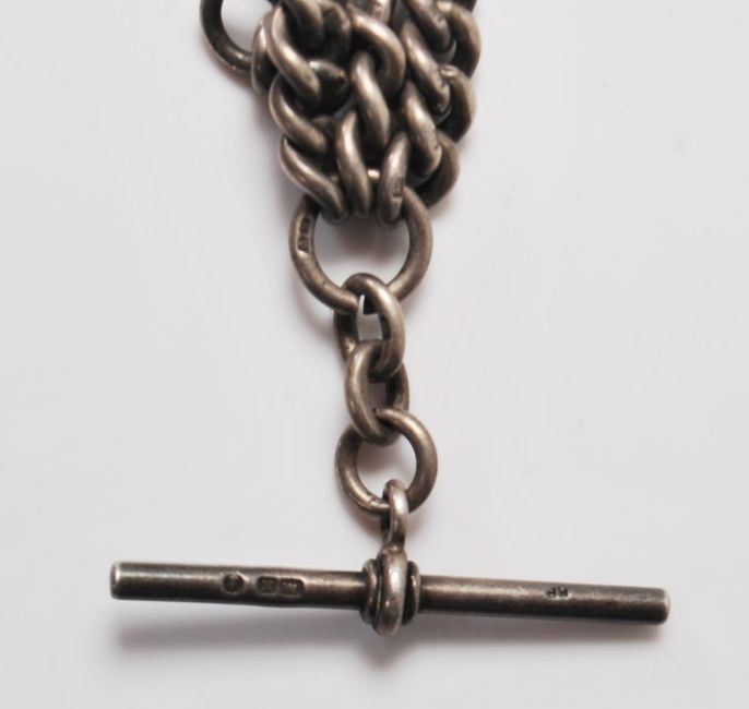 A hallmarked silver Victorian double pocket watch Albert Chain With silver hallmarked T-bar, chain and claps. Hallmarks for Birmingham 1859 K