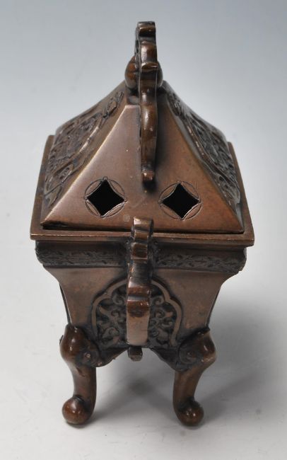 A vintage 20th Century bronze Chinese censer having a pierced lid over a finely decorated body with twin handles raised on cabriole legs. Height measures 13cm.