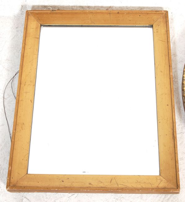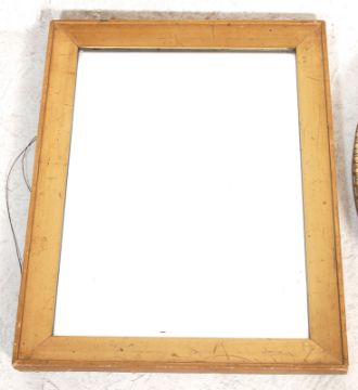A Victorian 19th century gilt wood cushion mirror with inset plate mirror glass to gilded wooden frame along with a circular /  round mirror with a moulded frame and paper labels to verso for F J Harris & Son. Measures 45 x 62 cm