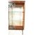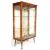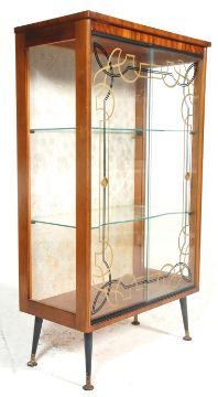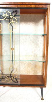 A retro vintage mid century, circa 1950's china display cabinet vitrine having a shaped top over glazed sliding gilt decorated doors with a glass shelved interior raised on ebonised tapering dansette style legs