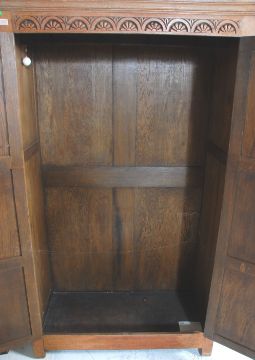 An early 20th century Jacobean revival carved oak double wardrobe and matching single bed. Each with carved linenfold designs to the doors / front , the wardrobe wardrobe with fitted interior.  Each with carved half moon design elsewhere.Measures 183x51cm.