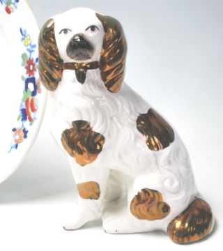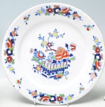 A collection of antique ceramic items to include a Mason's ironstone plates to include one decorated with florals and precious objects and another having transfer printed Chinoiserie decoration on domestic scene with patterned borders and painted details, together with a Staffordshire mantel dog, a mantelpiece in the form of a horse, along with a pair of blue and white Staffordshire “ for a good boy “ children mugs. Measures: 24cm tall.