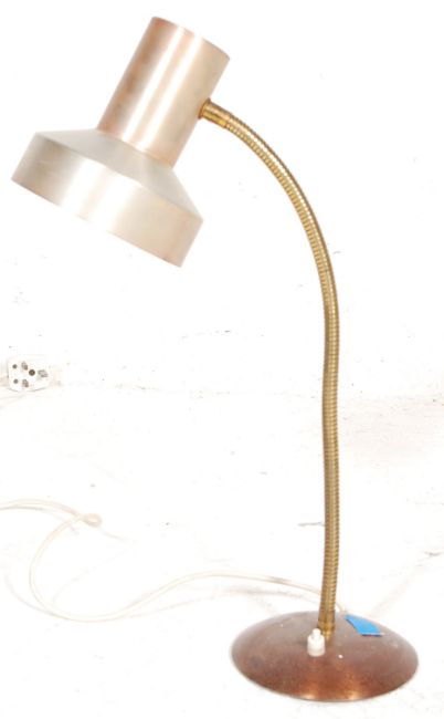 A vintage retro Italian design mid century anglepoise goose neck desk lamp having a stepped conical shade with an adjustable exposed metal arm with round dome base