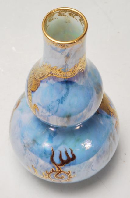 A 1930's Wedgwood fairyland lustre double gourd blue lustre vase having a mottled blue ground with a gilt Chinese dragon design to the sides with further gilt patterning to the inner tim with a lustre glaze throughout. Base marked Wedgwood Z4829.