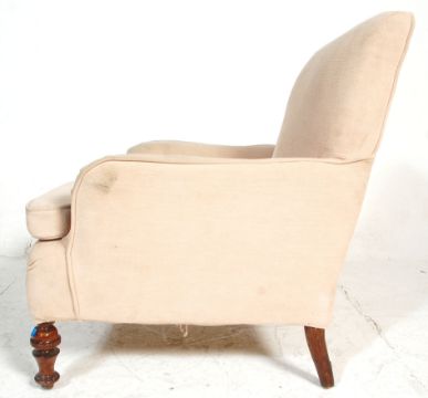 A stunning early 20th century  easy armchair in the manner of Howard & Sons. The chair having white fabric upholstery and raised on tuned bobbin legs with metal castors.  Measures 88 x 75 x 77 cm.