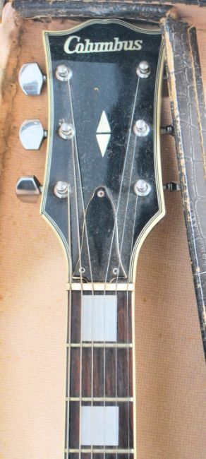 A vintage 20th Century Columbus Les Paul style electric guitar having a black body with four chrome dials, two humbucker pickups, and block fret markers to the neck having chrome tuning pegs to the headstock, set within a vintage crocodile skin guitar carry case.