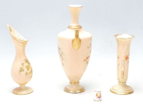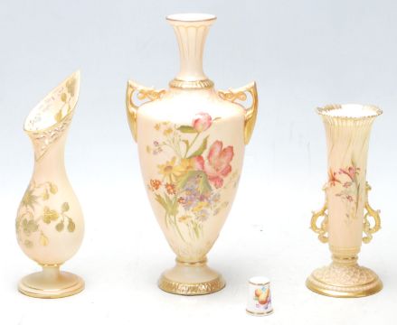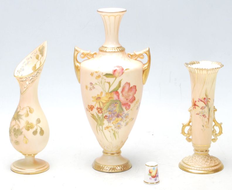 Group of Three Royal Worcester blush ivory vases, hand painted with flowers and gilded decoration, signed to the base, together with a thimble decorated with fruit. Measures: 21cm high.