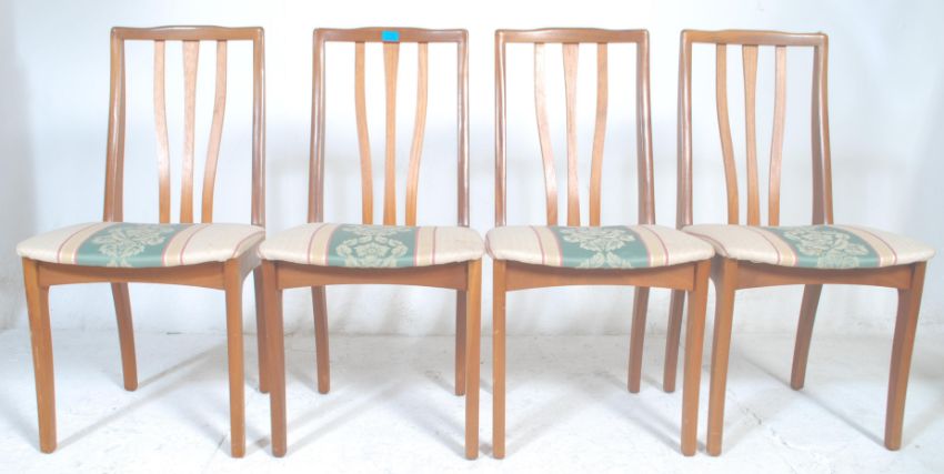 G-Plan Furniture - A set of four vintage retro G Plan teak wood dining chairs having floral padded seats with pierced and angled backrests. Raised on square legs. Measures 94 cm high x 46 cm wide x 46 cm deep.