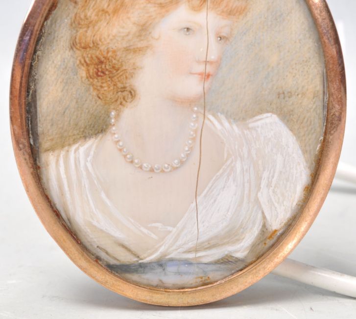 An early 20th Century Edwardian portrait miniature on ivory set with in a gilt oval frame ebing hand painted depicting a female figure wearing a pearl necklace on green background. Small signature present (possibly Hook).