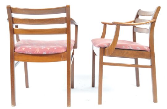 White & Newton - British 20th century Design - A set of six mid century teak wood dining chairs by White & Newton. Raised on squared legs with upper return stretchers to the sides. The chairs with believed original upholstered pad seats having arched and railed back rests. The set comprising four standard chairs and two carver chairs. Measures approx 72cm x  54 x 44cm.