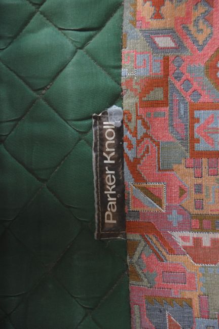 Parker Knoll - A pair of mid century Parker Knoll P.K. 1118 -26 vintage open framed armchairs / easy chairs. Each raised on show wood open frames with tapering legs and shaped elbow supports. The chairs being upholstered in abstract geometric fabric. Measures approx; 92x70x65cm