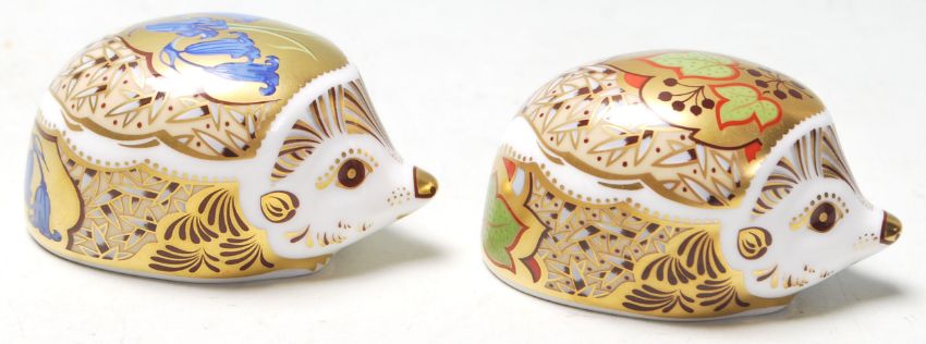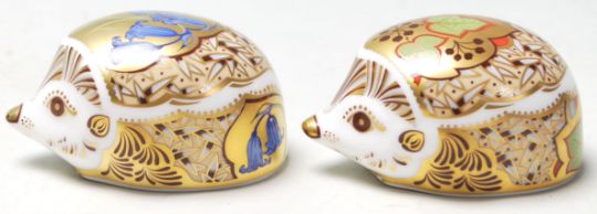 A pair of Royal Crown Derby Paperweights to include Bluebell and Ivy both in the form of hedgehogs. Both decorated in the Imari style with gilt decoration with gold stoppers. Height measures 3cm.