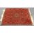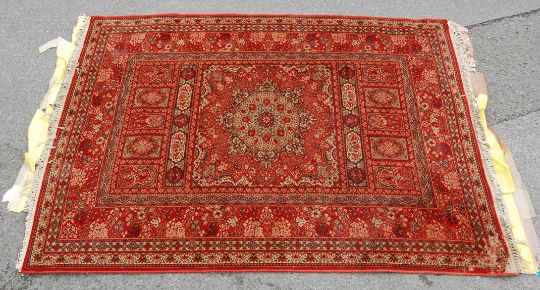 A 20th Century Persian / Islamic rug set on a red background with a central medallion set within a square border surrounded by floral sprays and lozenges with tasselled edges.
