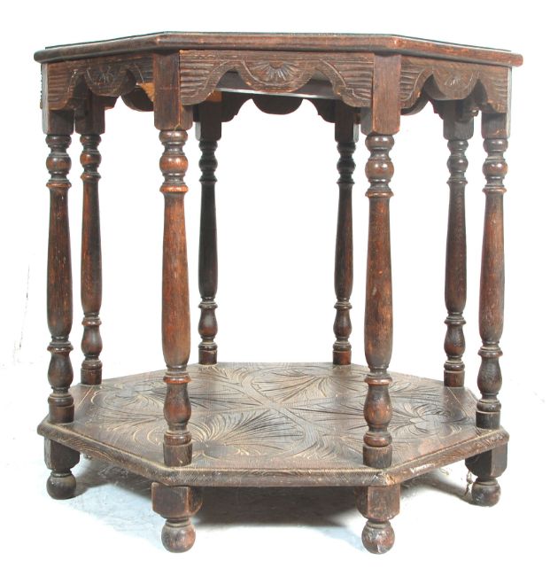 A 19th Century Victorian oak centre table of octagonal form having a carved table top over six turned supports on an under tier shelf raised on turned feet. Measures 74 x 81 x 81 cm.
