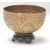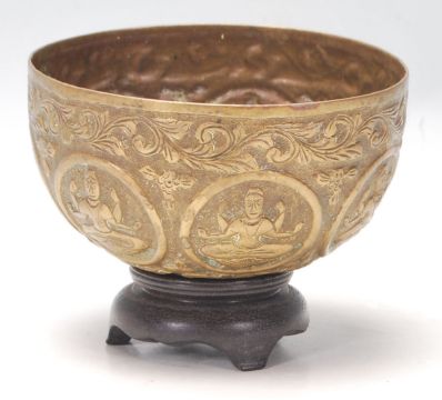An antique Middle Eastern brass prayer bowl with hand-carved religious figurine to the centre, floral band decoration to the rim and base, raised on hardwood circular base. Measures: 7cm high.