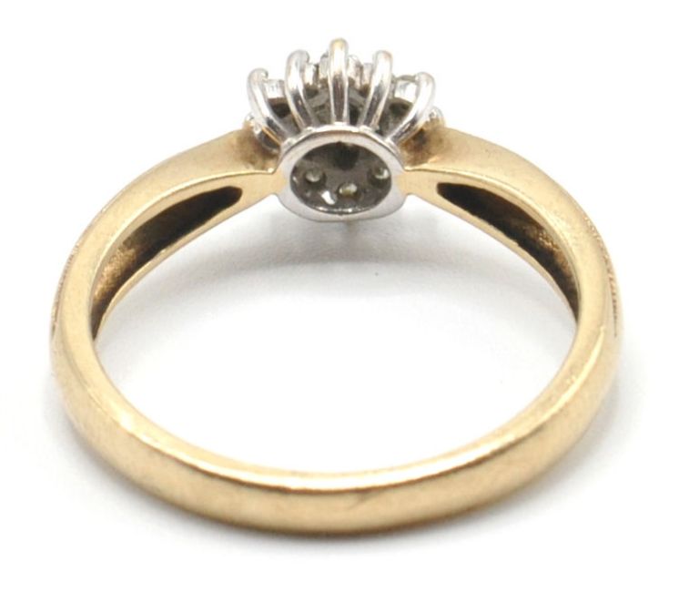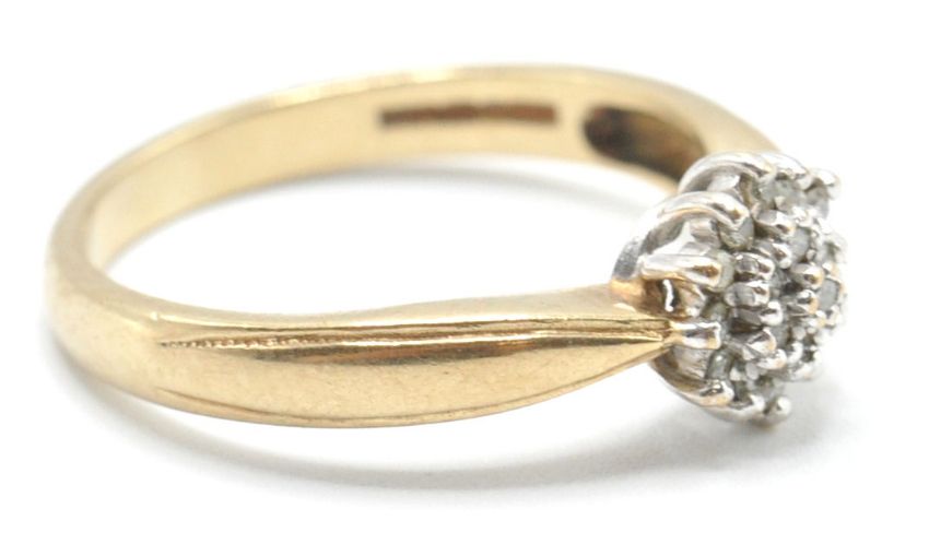 A hallmarked 9ct gold and diamond cluster ring having a cluster of round cut diamonds to the head with pinched shoulders. Assay marked for Birmingham. Weight 2.8g. Size P.