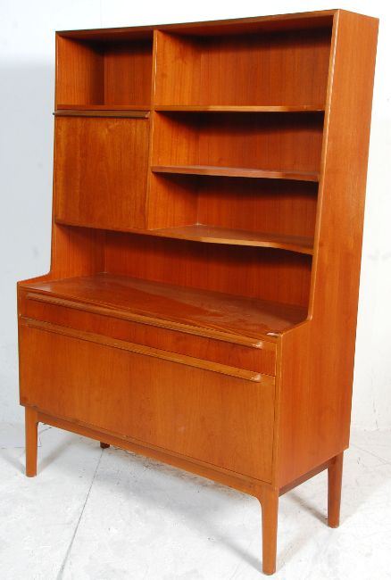 A.H. Mcintosh & Co. Ltd., Kirkcaldy, Scotland.  A mid century teak wood room divider - bookcase cabinet. The upright back with a series of shelves and fall front cabinet over bank of drawers and further cabinets beneath. Measures 110 x 43 x 158cms high.